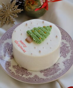 きび砂糖を使用した米粉スポンジ生地に豆乳生クリームとおさぜん農園様の甘みたっぷりな苺を贅沢にハーフカットのまま2段にサンドし、宮崎県のマルイシゑん様の有機抹茶を使用した豆乳バタークリームでツリーを絞りました。