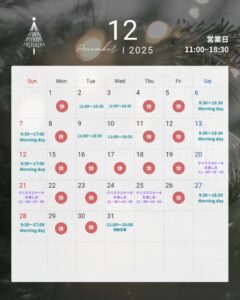 12月はクリスマスや年末に向けて特別営業日がございます。